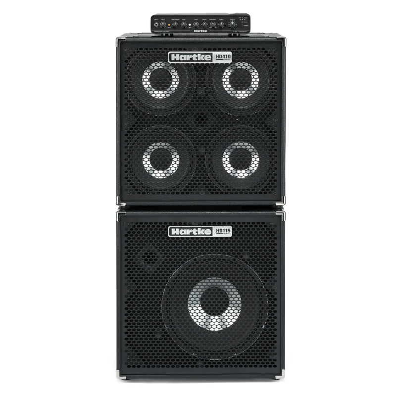 2 gabinetes con los mejores componentes de hartke serie HD, ruedas incorporadas, el gabinete hd115 de un parlante de 15" sumado al gabinete hd410 de 4 parlantes de 10"