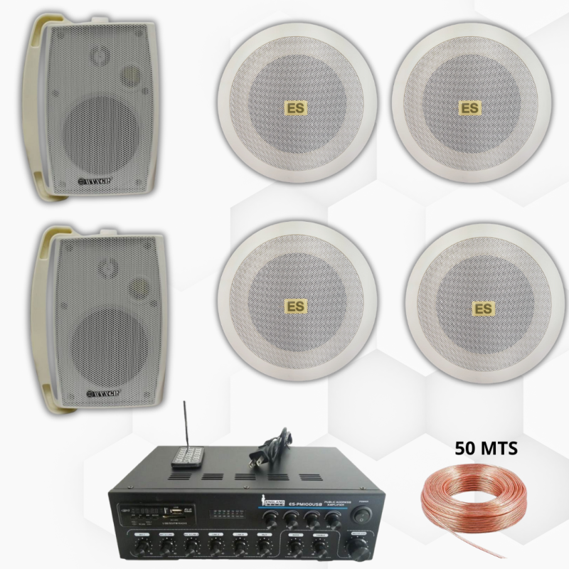 Este Kit está diseñado especialmente para el hogar con el control de 4 zonas de volúmen, el amplificador posee radio, conexión para flash memory, bluetooth, entrada de audio y micrófono. Desde el amplificador se puede elegir el volúmen de cada zona: 2 parlantes de tumbado para sala, 2 parlantes de tumbado para comedor y 2 parlantes de pared para el patio o barbacoa (controlados por la zona 3 y 4 del amplificador).