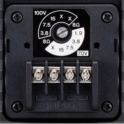 En la parte trasera se halla un selector de llave para elegir entre un sistema distribuido de 70V/100V y un sistema de sonido de 8Ω. Este ajuste se realiza fácilmente girando el selector con un destornillador. Los terminales y el selector utilizan un tapón de protección que se incluye con los altavoces.