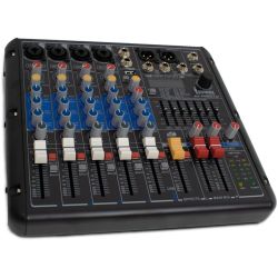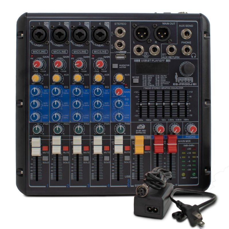 Consola de 6 canales con interfaz USB, efectos DSP y Bluetooth, ideal para eventos y estudios.