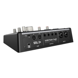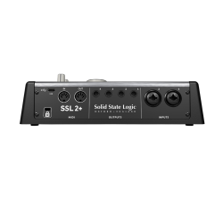 En la parte trasera, el SSL 2+ MKII cuenta con tomas Neutrik XLR Combo para entradas de micrófono/línea, cuatro salidas balanceadas, E/S MIDI DIN de 5 pines y conector USB.
