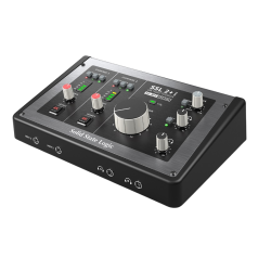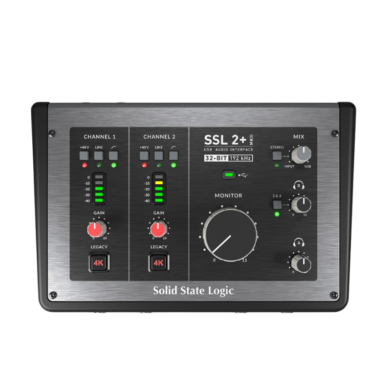 El SSL 2+ MKII está equipado con dos preamplificadores de micrófono de alto rendimiento diseñados por SSL que ofrecen un enorme rango de ganancia de 64 dB, junto con un rango dinámico líder en su clase de 116,5 dB y un EIN de -130,5 dBu. Los preamplificadores de micrófono también pueden funcionar en modo LINE para conectar sintetizadores o en modo INSTRUMENT para conectar guitarras/bajos.