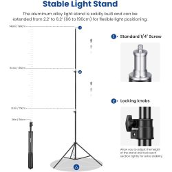 El soporte de luz de aleación de aluminio tiene una estructura sólida y se puede extender de 26« a 75» (66 a 190 cm) para un posicionamiento flexible de la luz. Las perillas de bloqueo le permiten ajustar la altura del soporte y bloquear firmemente cada sección para una mayor estabilidad.