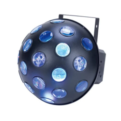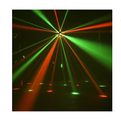 -Brillantes haces giratorios rojos, verdes y azules disparados desde 19 lentes que cubren una gran área