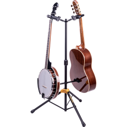 El soporte doble para guitarras HERCULES GS422B PLUS tiene capacidad para dos instrumentos y cuenta con horquillas plegables con sistema Auto Grip System (AGS), embrague de ajuste instantáneo de la altura, contactos acolchados con espuma de fórmula especial (SFF) y respaldos ajustables.