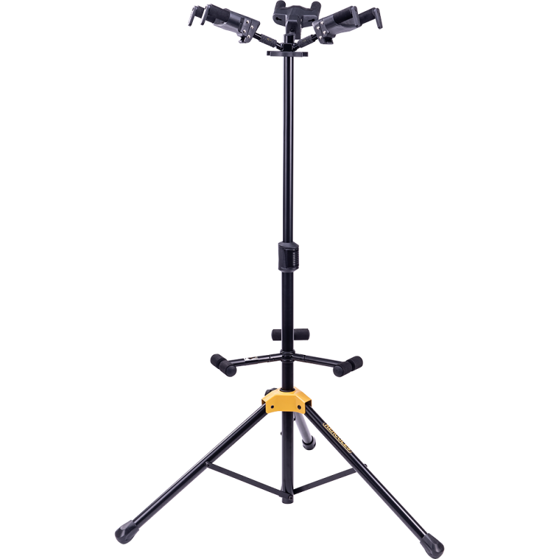 El soporte para tres guitarras HERCULES GS432B PLUS tiene capacidad para tres instrumentos y cuenta con horquillas plegables con sistema Auto Grip System (AGS), embrague de ajuste instantáneo de la altura, contactos acolchados con espuma de fórmula especial (SFF) y respaldos ajustables.