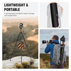 -Monopie convertible: desenrosque la pata del trípode con empuñadura de espuma y obtendrá un monopie ajustable de 53 a 189 cm (21« a 74»). Fije la columna central al monopie después de desmontar el gancho inferior para la bolsa de arena y utilice el monopie para diversos estilos de fotografía, como eventos deportivos, fauna, astrofotografía y mucho más.