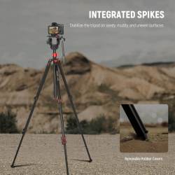 -Patas del trípode reversibles: rango de altura: 24«-72» (61-181 cm). Las patas pueden colocarse en 3 ángulos para fotografía en ángulo bajo, macro y aérea. Las patas de goma proporcionan mayor estabilidad y protección contra arañazos. Retire las patas de goma para utilizar puntas en superficies embarradas, arenosas y otras superficies irregulares.