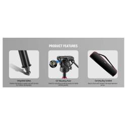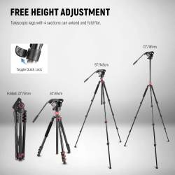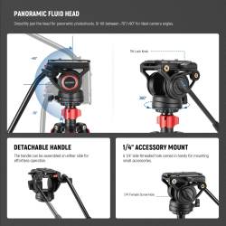 -Cabezal panorámico fluido de primera calidad: toma magníficas fotos panorámicas con el cabezal panorámico de 360° y mantén siempre el nivel recto con la ayuda del nivel de burbuja. El ajuste de inclinación de -70°/+90° te permite colocar la cámara en cualquier ángulo para tomar fotos en ángulo bajo y desde arriba, o tomar fotos en vertical u horizontal. El mango telescópico se puede montar a ambos lados y girar el cabezal fluido con cualquiera de las dos manos. Orificio lateral de 1/4" para micrófonos, monitores o luces.